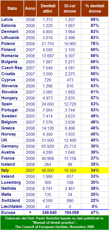 La tabella mostra i dati europei della presenza femminile fra i dentisti: