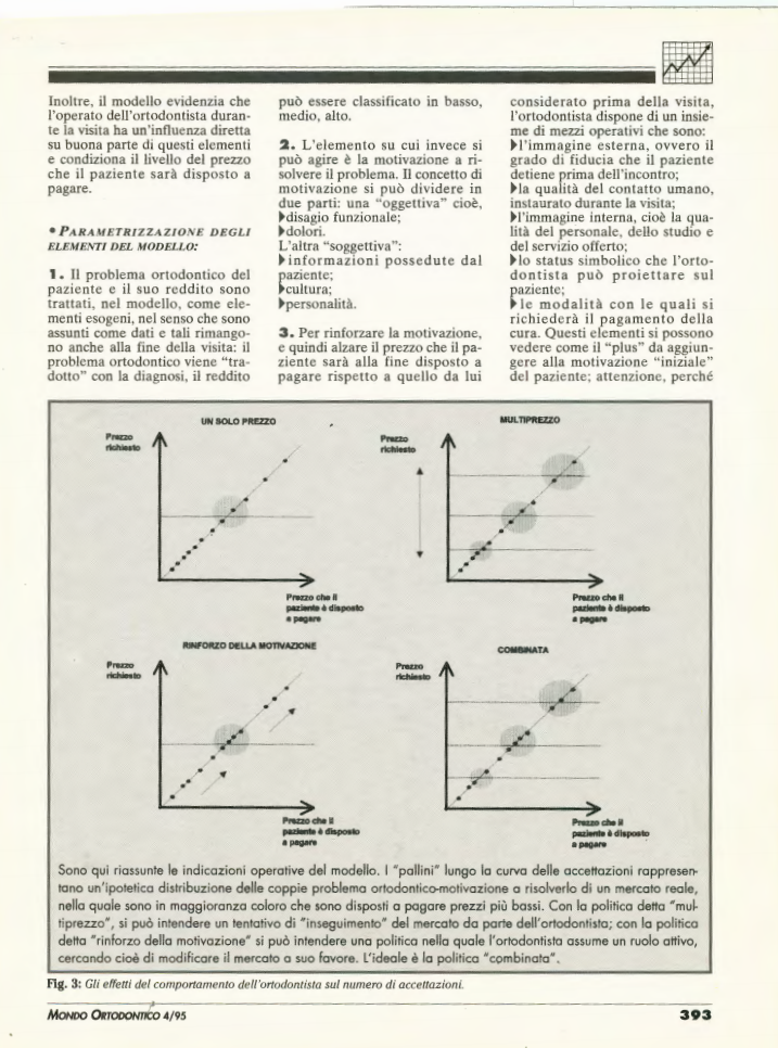 Cominciamo a ragionare sulla questione della misura del reale guadagno, o della perdita, che dalla conoscenza del costo della prestazione può scaturire. Se ci si accorgesse che ci si rimette, bisognerebbe ovviamente aumentare i prezzi, o rinunciare per il futuro ad eseguire quella particolare prestazione. Ma è possibile? Per quanto riguarda i prezzi, l’informazione sul costo delle cure sarebbe utile se i primi fossero variabili a piacimento, cosa che è fattibile più in teoria che in pratica. Si pensi, al limite, ai prezzi per le prestazioni convenzionate, decisi in modo del tutto indipendente dalla volontà del dentista, il quale può solo accettarli, e si capirà che anche se si scoprisse che ci si rimette, l’unica libertà sarebbe quella di rifiutare di eseguire la prestazione in convenzione. Si pensi anche che i prezzi dei dentisti, in linea generale, non sono quasi mai basati sui costi di produzione, che per la maggioranza dei professionisti rimangono tuttora ignoti. I prezzi, nella stragrande maggioranza degli studi, si fissano infatti sulla base di ciò che si ritiene essere un prezzo praticabile nella particolare situazione del professionista, del territorio e del paziente. Tutti elementi che nulla hanno a che fare con i costi.